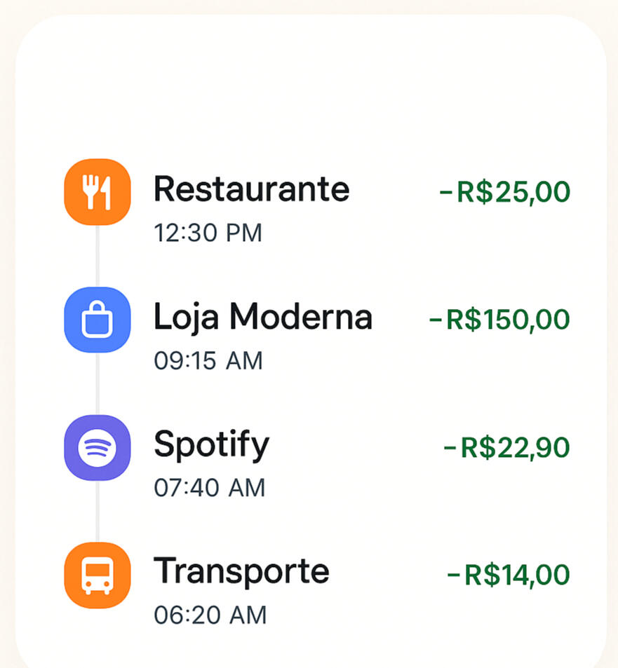 Todos os seus gastos organizados por categoria, data e tipo.Tenha insights em tempo real sobre seu comportamento financeiro.